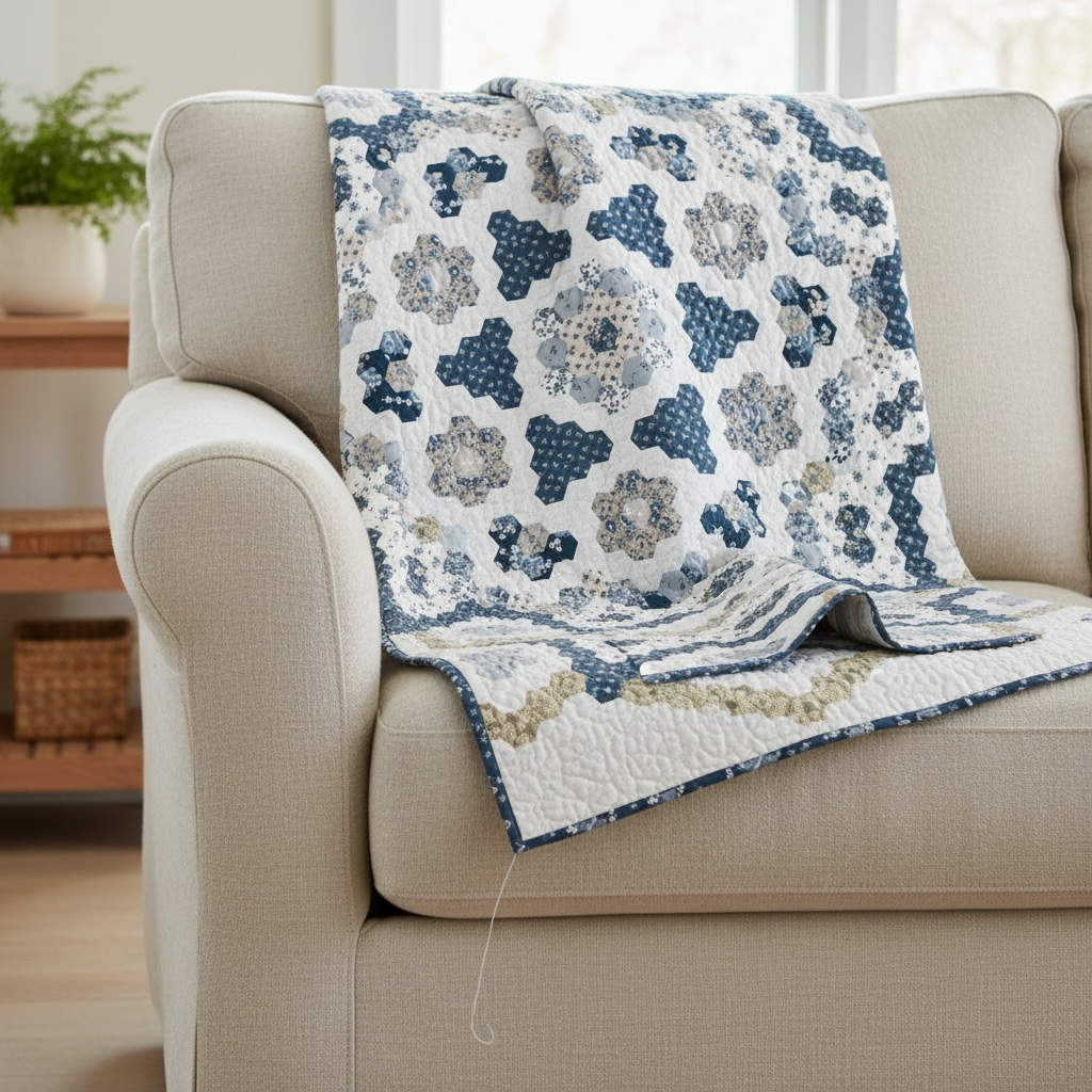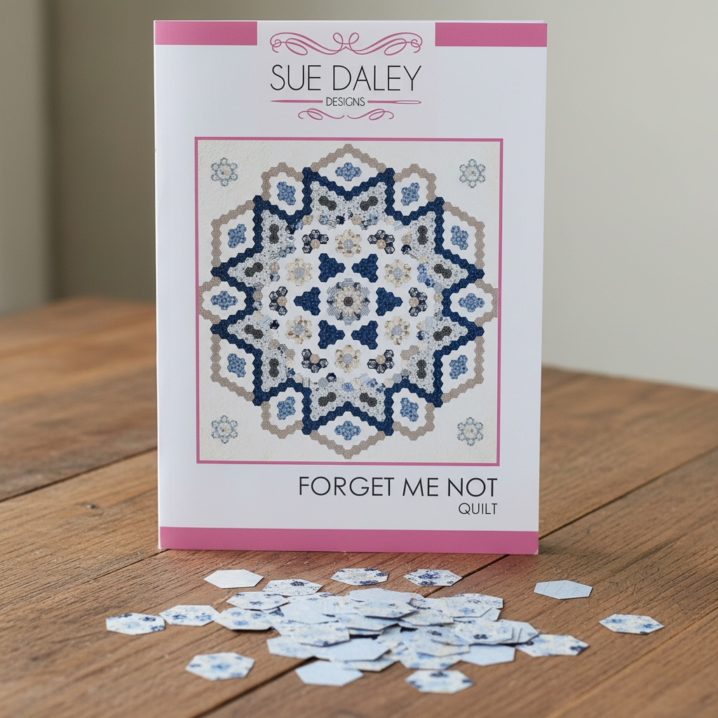Login to View PriceExperience the enduring charm of the Forget Me Not Quilt, a stunning English Paper Pieced (EPP) masterpiece. This design features 1" hexagons arranged in a beautiful all-over pattern, creating a sophisticated and classic look that is perfect for lovers of traditional hand piecing.